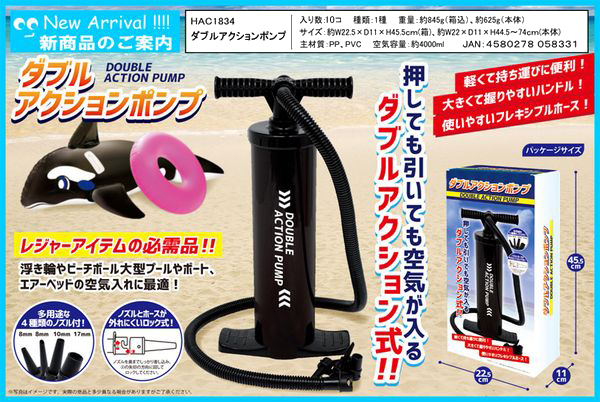 ●押しても引いても空気が入る。ダブルアクション式。押しても引いても空気が入るダブルアクションポンプです。