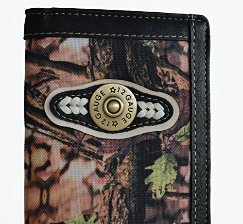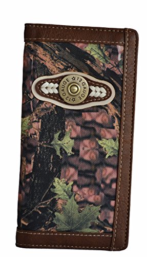 Binding : Apparel Product Description Top quality camouflage print outdoor secretary long slim wallet with 12 gauge shell accent. Front canvas camo print design with contrasting trim details.Antique brass tone 12 gauge shells concho on front with braided accent. Interior 12 credit card slots, 1 clear Id, removable 6 clear credit card holder, 3 compartments for your cash or receipts. Exterior back slip pocket. Measurements 7" x 3 1/2" 0