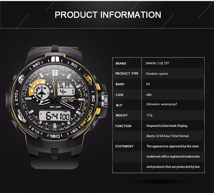 Feature:Water Resistant,LED display,Stop Watch,Auto Date,Back Light,Shock Resistant,Alarm,Swim