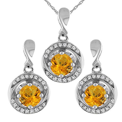 -. Title : 14K White Gold Natural Citrine Earrings and Pendant Set with Diamond Accents Round 4 mm