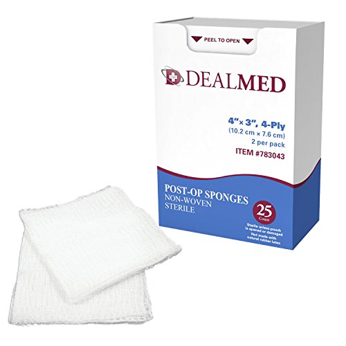 Studio : Dealmed Publisher : Dealmed Binding : Health and Beauty Product Description Dealmed wound care products represent over a decade of quality and innovation trusted by health care professionals around the world. These Non woven post op sponges provide superior absorption for superior patient care. They are sterile 2's 4" x 3" 4 Ply and come 25 sponges in each box. 0