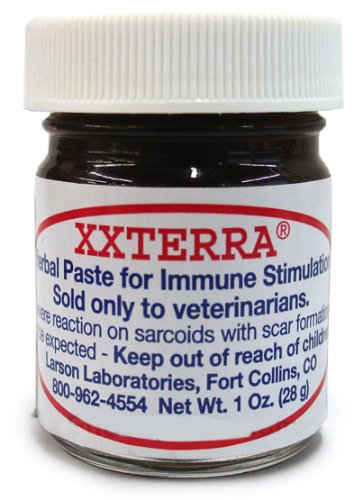 -. Feature : XXTERRA is an herbal formulation of bloodroot powder and zinc chloride solution, combined and stirred into a smooth brown paste. / Bloodroot contains sanguinarine (the P.R.Imary component), chelarathrine and protopine, all of which are alkaloids. / Zinc chloride promotes inflammation of the sarcoids surface and with the alkaloids, alters the sarcoid cells so they become antigenic to the host. / Accordingly, XXTERRA alters the antigenicity of a sarcoid to stimulate the host's immune system and result in an immune rejection reaction of the sarcoid.