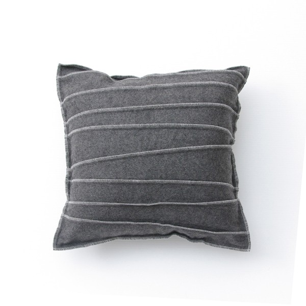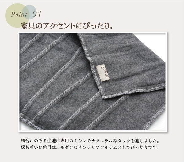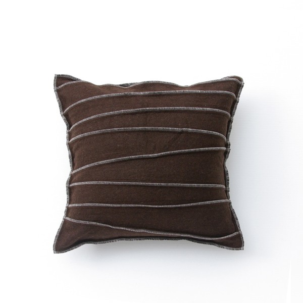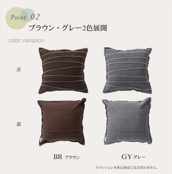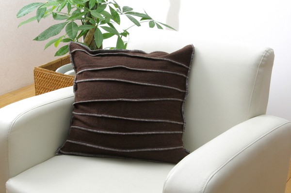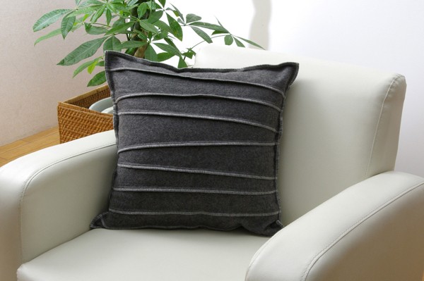 ベーシックな色目のソファーに合わせやすい色にこだわりました。素材感のある生地に専用ミシンでタックを施しました。中にクッションを入れるとタック部分が立ち、かっこよく、また温かみのある風合いに仕上げています。ちょっとお洒落なクッションとして、お部屋のイメージアップにお使い下さい。本商品はファスナータイプですので付け外しが簡単です。