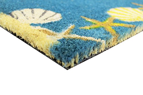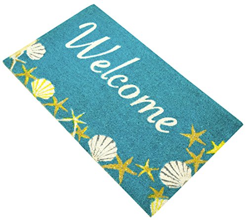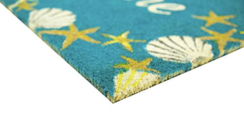 Add a touch of the beach and greet guests with coastal charm, shells, starfish and the deep blue sea with the stunning aqua, teal, turquoise door mat. Thickly woven with natural fiber from sustainably harvested coconuts, our coir doormat is perfect for entry ways, garages, patios, porches and any high traffic areas inside or outside your home. This eco-friendly and durable rug easily absorbs moisture, resists mildew and most stains, and welcomes guests with style. This all weather welcome mat can be used indoors or outdoors to stop mud, rain, snow, dirt and debris in their tracks. The best part? Easy clean up. To clean, just shake the mat off.Feature