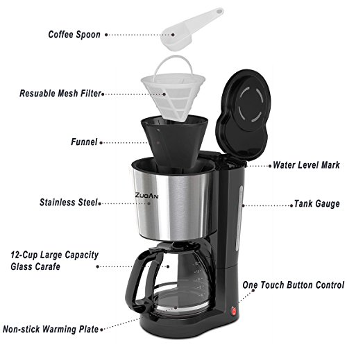 Classic functionality keeps brewing simple and easy. Making it easy to serve brewed coffee for your family or group. Customizable Brewing Options Drink your favorite coffee every morning using features like the brew strength selector and the option for small-batch (1-12 cup) brewing that maintains all the flavor of a full brew. Features • Maximum 1.5L / 12-Cup • Removable filter basket lifts out for fast and easy filling and cleaning • Brewing pause 'n serve lets you pour a cup of coffee while the coffeemaker is still brewing • Water window shows the amount of water in the reservoir for accurate filling • Stain-Resistant Warming Plate is easy to clean and prevents staining Easy To Use 1. Open the top lid and fill the water tank with drinking water. 2. Place the funnel into the funnel support, then put the filter correctly. 3. Add coffee powder into filter, then close the top lid. 4. Place the glass coffee pot on the keeping warm plate. 5. Press the power button, indicator light will turn on red, then appliance will begin working. Specification Rated Voltage: 120V, 60Hz Rated Power: 900W Dimensions: 8.86 inches(L)*7.87 inches(W)*13.98 inches(H) Package Included 1 X 12-Cup Drip Coffee Maker 1 X Glass Coffee Pot 1 X Reusable Mesh Filter 1 X User manual Warm tips Please just brew water to clean the water tank for the first use or for use after a long period of time. Please turn off the power button, if you wouldn't like to keep your coffee drinking anymore. Guarantee We are attention to detail, and committed to providing each customer with the highest standard of customer service. We provides Worry-free One-Year Warranty.Feature