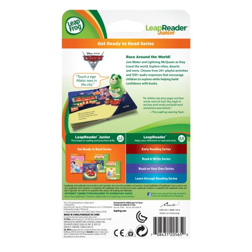 -. Binding : Toy -. Brand : LeapFrog -. EAN : 0115971245654 -. Feature : Build early vocabulary skills while exploring different ways to get from place to place in this interactive LeapReader Junior board book. / 24+ activities and 150+ audio responses. / Teaches action words and position words. / Ages 1-3 years. / Works only with Tag Junior and LeapReader Junior Book Pal (sold separately). -. IsAdultProduct : 0 -. IsAutographed : 0 -. IsMemorabilia : 0 -. Label : Leapfrog -. Manufacturer : Leapfrog -. Model : 80-20565E -. MPN : 80-20565E -. PackageQuantity : 1 -. PartNumber : 80-20565E -. Platform : Windows -. ProductGroup : Toy -. ProductTypeName : TOYS_AND_GAMES -. Publisher : Leapfrog -. SKU : mon0000205677 -. Studio : Leapfrog -. Title : Leapfrog LeapReader Junior Book: DisneyPixar Cars 2: World Adventure (works with Tag Junior) -. UPC : 115971245654 -. Warranty : 90 day warranty against manufacturer defects