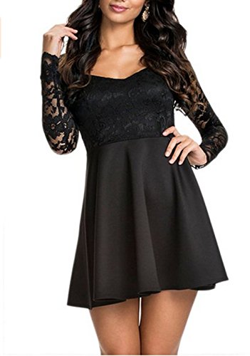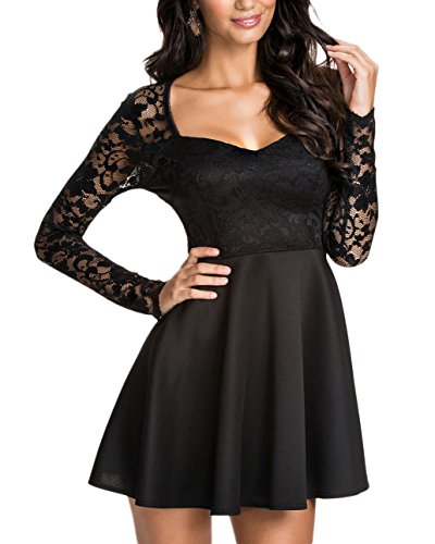 This Black Lace Bodice Skater Dress is sure to turn some heads by the body-flattering shape which only stands out your advantages while cover those you unwanted to show in public. Partial lined. The lace overlay bodice and sleeves add you femininities, low cut mild neckline and fluttering skirt the lower part.