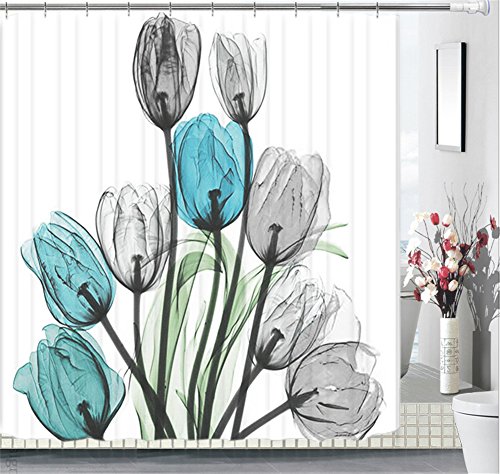 Floral Fabric Shower Curtain Set 72"x 72" Thick Bathroom Curtains,White with Blue Grey Tulip Romantic Air,Waterproof Mold Mildew Resistant Unique Art Designed with 12 Stainless Steel Rings