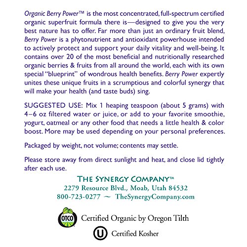-. Binding : Health and Beauty -. Brand : The Synergy Company -. EAN : 0852971004231 -. Feature : 20+ of the planet's most powerful organic berries & superfruit powders / Healthy support for your heart, eyes, skin, brain, immune system and so much more! / Naturally delicious taste & mixes easily with water, juice, smoothies, yogurt, oatmeal & more / Abundant source of vitamin C, anthocyanins, polyphenols, ellagic acid & other phytonutrients / Certified Organic and Kosher, Gluten-Free, Chemical-Free, Non-GMO, No Fillers/Sweeteners -. IsAdultProduct : 0 -. Label : The Synergy Company -. LegalDisclaimer : Actual product packaging and materials may contain more and different information than what is shown on our website. We recommend that you do not rely solely on the information presented and that you always read labels, warnings, and directions before using or consuming a product. Please see our full disclaimer below. -. Manufacturer : The Synergy Company -. MPN : 1BPPO -. PackageQuantity : 1 -. PartNumber : 1BPPO -. ProductGroup : Health and Beauty -. ProductTypeName : HEALTH_PERSONAL_CARE -. Publisher : The Synergy Company -. Studio : The Synergy Company -. Title : Pure Synergy Organic Berry Power with 21 SuperFruits 8oz Powder by The Synergy Company -. UPC : 852971004231