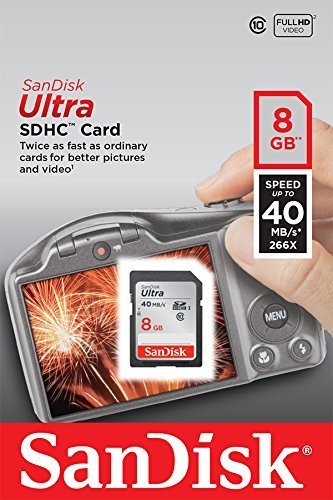 Record Full HD 1080p video with this Class 10 compliant 8GB Ultra UHS-I SDHC Memory Card from SanDisk. With enhanced data read speeds of up to 40MB/s this Ultra SDHC memory card is designed to suit the needs of compact and mid-range point and shoot cameras. You can also save and store a variety of files such as music, movies, documents and more. The writable label found on the card allows you to write down what is saved to the card while the built-in write protect switch helps to prevent accidental data loss. This card, as with most SanDisk cards, comes waterproof, temperature proof, x-ray proof, magnet proof, and shock proof to take your files with you nearly anywhere you go. Class 10 performance for Full HD Video (1080p) Read speeds up to 40 MB/s Writable label for easy identification and organization Engineered with UHS-I bus architecture This SD memory card comes waterproof, temperature proof, x-ray proof, magnet proof, and shock prooFeature