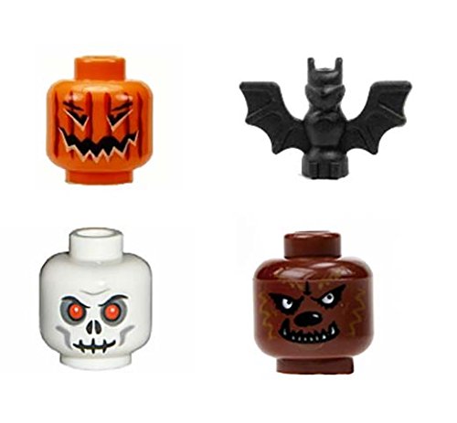 -. Feature : Genuine New L.E.G.O® Parts / L.E.G.O Minifigures: Heads Only! / One werewolf, one evil skull with red eyes, one Jack-O-lantern, one bat
