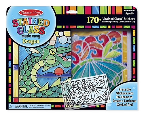 This peel-and-press sticker craft gives kids everything they need to easily create a spectacular piece of "stained glass" art. Just hold up the sheet of colored stickers to the clear frame, peel them off one at a time, and stick them on. Grooves and outlines on the frame make it easy to fit each sticker--featuring realistic textures like bubbles or swirls--into just the right spot. Use the included cord and suction cup to hang the finished artwork in a sunny window to see the remarkable dragon shimmer to life. Young artists will be enchanted by the results and proud to show them off!.Feature