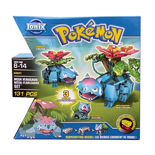 IONIX Pokemon Mega Figure set comes with shapeshifting bricks and additional pieces to create 3 builds: Bulbasaur, Venusaur, and Mega Venusaur.