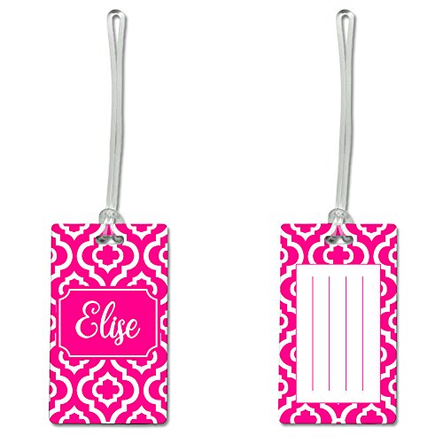 Product Description Your luggage or any bag will stand out with this great looking personalized luggage tag. The luggage tag features a hot pink quatrefiol trellis design with a name in the middle. Simply select Customize Now and you add the name you would like in the bag tag. The luggage tag measures 2.5" X 4.25 and a 6 inch clear plastic loop for easy attachment is included. The bag tag is made of a hard fiberglass reinforced plastic. Your bag will definitely stand out with this great looking luggage tag. The back of the luggage tag features an outline of the same pattern as the front and then 4 lines for you to write any information you would like. Note, the personalization is only the name on the front. The 4 lines on the back are blank and designed for you to write the information you would like. 0