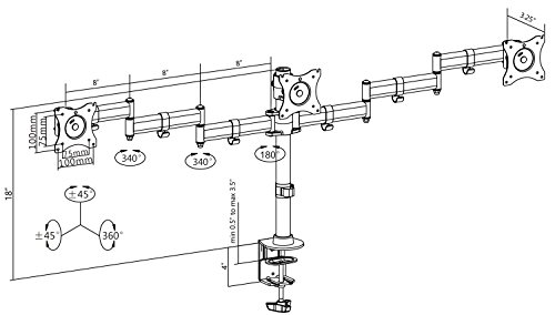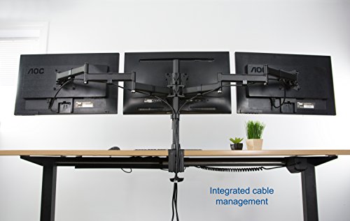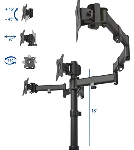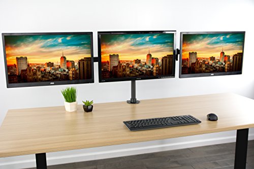 -. Binding : Electronics -. Brand : VIVO -. EAN : 0641020645750 -. Feature : COMPATIBILITY - Fits three computer monitors 13" to 24" with VESA 75x75mm or 100x100mm mounting holes (will fit 27" screens but will allow very limited angled screen positioning) / TRIPLE MONITOR FORCE - Clear up valuable work space and increase work efficiency with a three monitors mount alignment / FULLY ADJUSTABLE - Mounting arms and plates offer 90° tilt, 90° swivel, and 360° rotation. Monitors can be placed in portrait or landscape shape / SOLID STEEL CONSTRUCTION - This stand was built to last with high grade steel and aluminum construction, and a rigid tested support system, easily supporting three screens weighing up to 17.6 lbs each / PERFECT MONITOR ALIGNMENT - The VESA plates allows each individual plate to be adjusted up and down by 1.1" so your monitors will be perfectly aligned -. Label : VIVO -. Manufacturer : VIVO -. Model : STAND-V003M -. MPN : STAND-V003M -. PartNumber : STAND-V003M -. ProductGroup : PC Accessory -. ProductTypeName : COMPUTER_COMPONENT -. Publisher : VIVO -. Studio : VIVO -. Title : VIVO Triple Monitor Adjustable Mount / Articulating Stand for 3 LCD Screens upto 24" (STAND-V003M) -. UPC : 641020645750