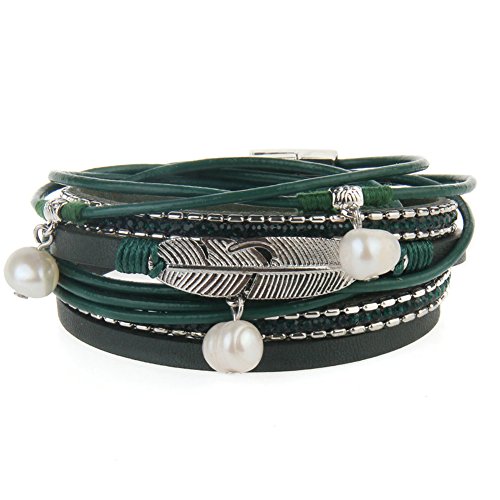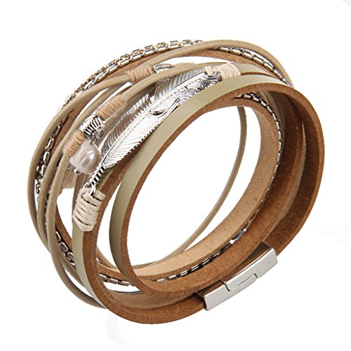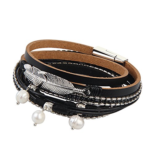 -. Title : Casual Women Leather Bracelet - Feather and Pearl Wrap Cuff Bangle - with Magnetic Clasp - for Mother's Day Gift By Jenia