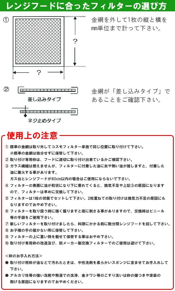 | 素材・材質 | 取り付け枠:スチール(黒焼付塗装) フィルター:ガラス繊維 |