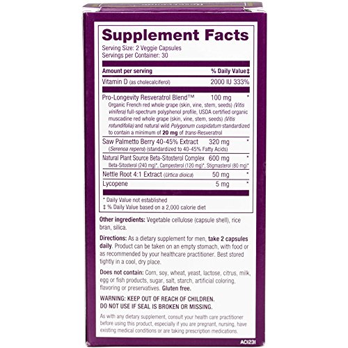 -. Title : Reserveage - Prostate Science, Aids Menâ€s Health by Supporting Prostate and Urinary Tract Function with Saw Palmetto, Vitamin D, Resveratrol, and Beta Sitosterol, 60 Capsules