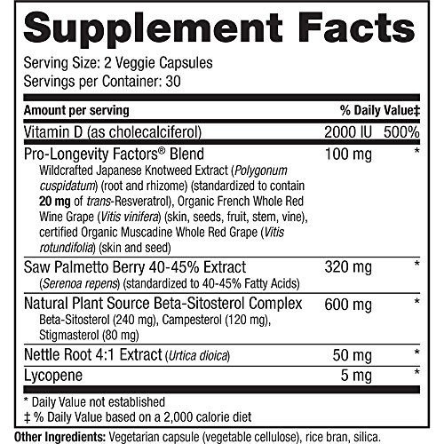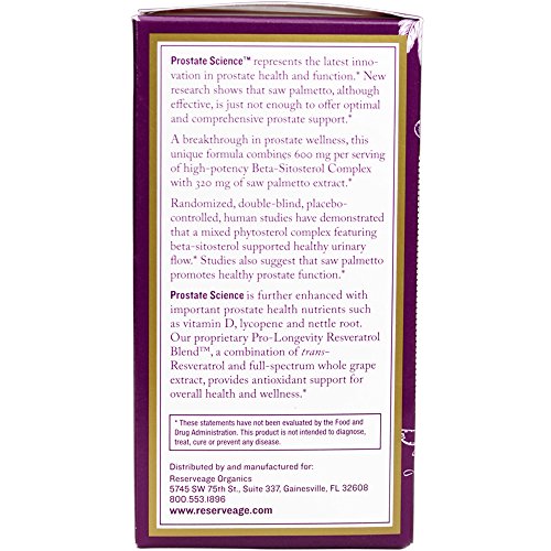 -. Feature : PROSTATE HEALTH: Scientifically formulated for men, Prostate Science supplies a powerful combination of ingredients specially selected for their benefits on prostate health. / SAW PALMETTO: To help support prostate function Saw Palmetto is included, which many health experts recommend for enduring prostate health. Beta-Sitosterol is added to help promote urinary health. / RESVERATROL: Experience the powerful polyphenols found in our proP.R.Ietary blend of standardized Japanese Knotweed and the skins of red wine and muscadine grapes. The polyphenols contained in resveratrol may help stimulate the SIRT 1 gene, or longevity gene. / PRO-LONGEVITY BLEND: Organic trans-Resveratrol is combined with French grapes in our proP.R.Ietary Pro-Longevity Factors Blend, processed only minutes away from our vineyards, ensuring unsurpassed quality, purity and freshness. / PROMOTE + NOURISH WELLNESS: What is Reserveage's Mission? To promote and nourish wellness - one body, one goal, one solution at a time in a way that incorporates sustainability and equal opportunity for wellness.