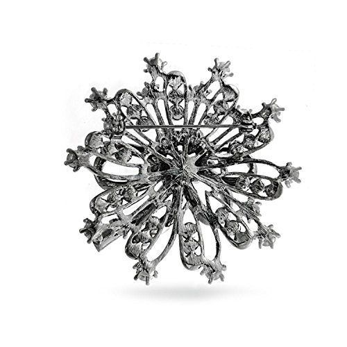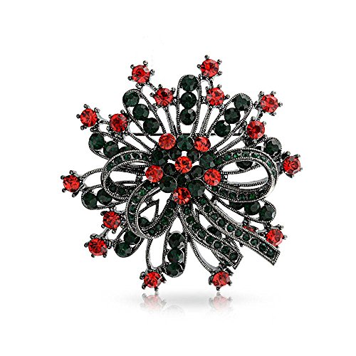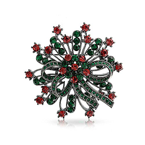 Your days will be merry and bright this holiday season with the addition of our vintage style crystal wreath brooch to your holiday best. The deep simulated emerald crystals and simulated ruby crystals accent our black rhodium plated Christmas flower pin perfectly to give it great color and style. The pave crystal bow in the middle of the design adds just the right feminine touch to our Christmas wreath pin. The black rhodium plating on our stunning Christmas wreath brooch pin will keep it tarnish resistant and shiny for many years of celebrations. Gift one of these affordable holiday pins to your grandma, a favorite aunt or your mom, since everyone loves wearing colorful crystal holiday pins and brooches. For a chic twist, use one of these crystal pieces as a scarf pin, hat pin or purse pin while you complete your holiday shopping.Feature