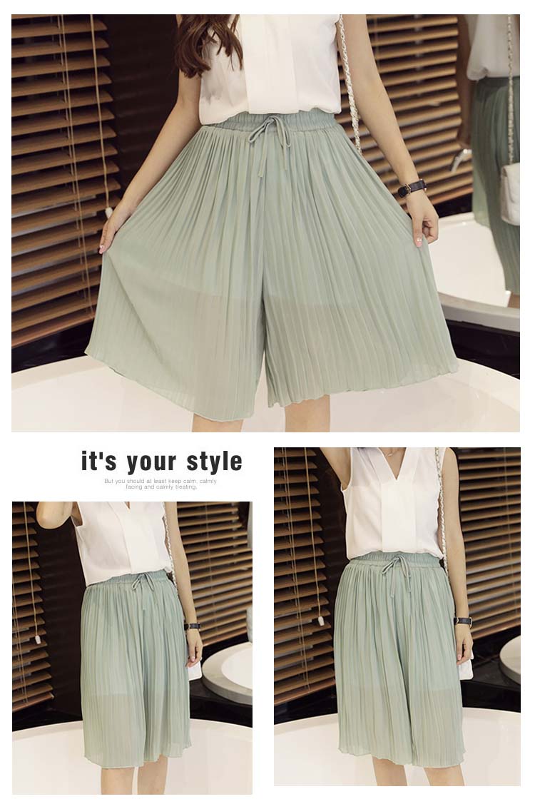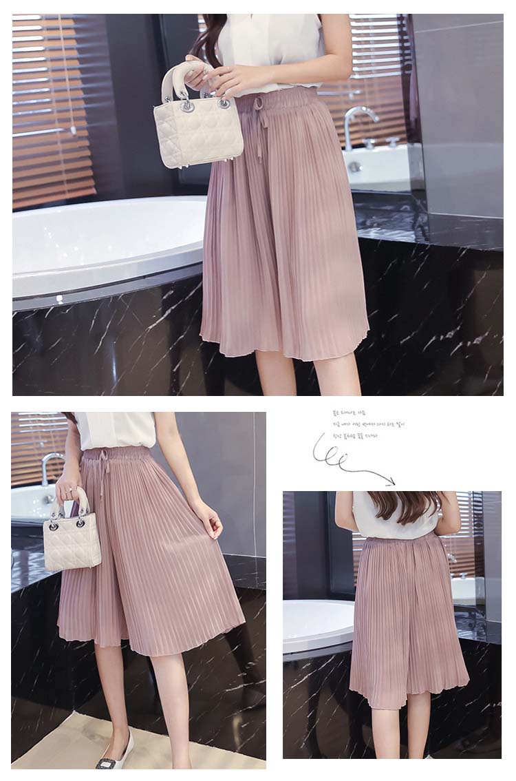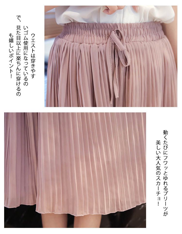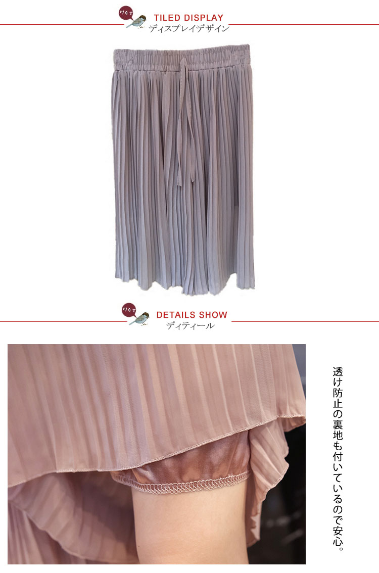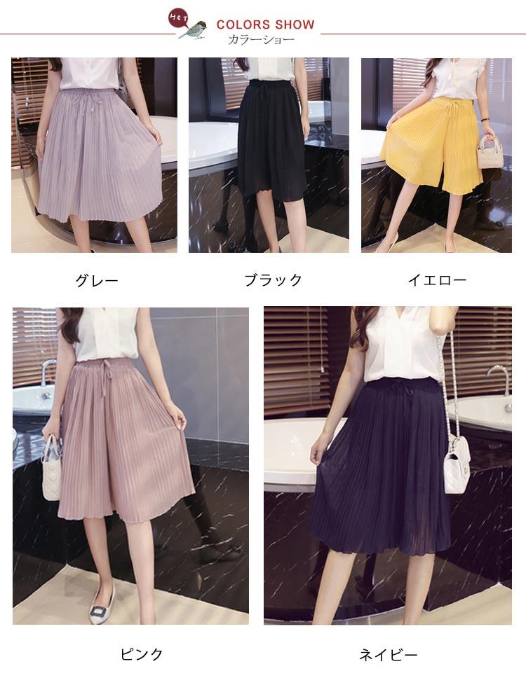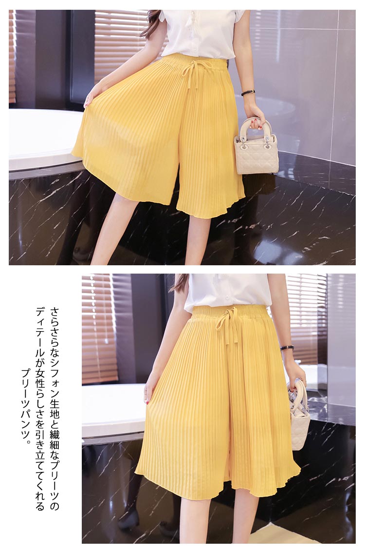 | 繊細なプリーツの揺れる姿が美しいワイドパンツ。さらさらなシフォン生地と繊細なプリーツのディテールが女性らしさを引き立ててくれるプリーツパンツ。太めのウエストゴムは、イージーにコーデが出来て高ポイント↑シンプルで使いやすいデザインなので、着回し力も抜群です! | |
