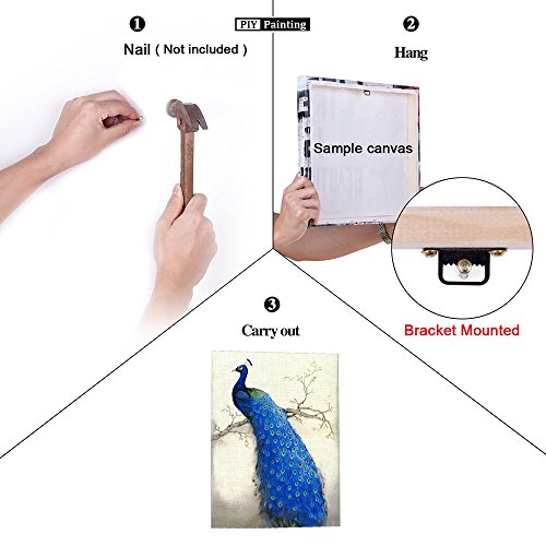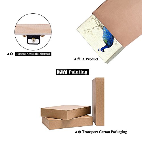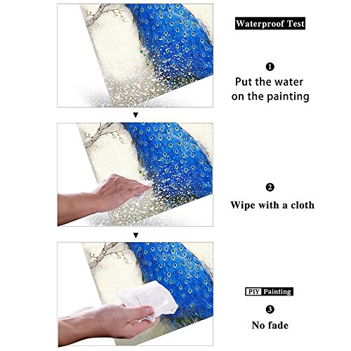 1: PIY painting's canvas wall art of beautiful blue peacock reflects your noble temperament and taste. Elegant peacock is the most kind, the most intelligent, free love and peace bird. In the Greek mythology, the peacock symbolizes the goddess Hera that bring the lucky and happiness for you and your lover. This canvas picture dimensions: 18"x12"x1"=45x30x2.5cm, bigger than A3 size.