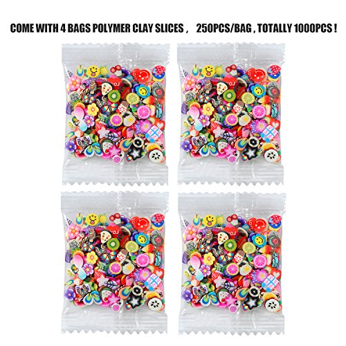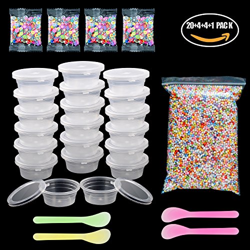 - Quantity:20 pack slime storage containers;15000pcs(1 bag) foam floam beads balls ;1000pcs(4 bags) mixed patterns polymer clay slices ;4pcs slime tools .
