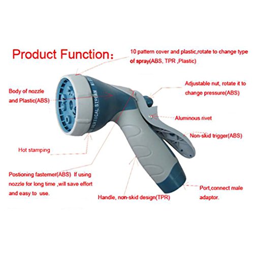 -. Feature : 【Multipurpose】Trigger 10 watering patterns of garden hose fittings have you covered. Great cleanup garden hose sprayer suitable for cleaning, watering plants, garden or automotive car wash, the soft shower to wash the dog. / 【Easy to Use】Water nozzle sprayer multiple spray patterns and flow volume are at your fingertips. / 【Save Water】The spray nozzle allow you to control the shape and flow of water. This will lead to less wasted water since you will use the hose more efficiently. / 【Ergonomic Design】Soft rubber coating makes nozzle slip-resistance and grip the handle comfortable. Hand free clip is designed for long time spray. / 【High Quality】Garden hose nozzle flexible and adjustable water flow with 300% more water flow than standard water hose nozzle.