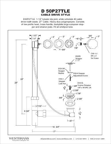 Westbrass D50P27TLE-26 Poly Tubular 27-Inch Cable Drive Bath Waste and Overflow, Polished Chrome
