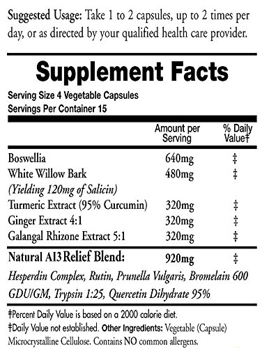 -. Feature : The natural alternative to over-the-counter or prescription anti-inflammatories, with a proP.R.Ietary blend of 12 herbs, enzymes and botanicals. / Designed to help you find relief from inflammation-based pain, such as joint or back aches, and inflammation-induced cramps. / With Boswelia, White Willow Bark, Curcumin and Ginger root / With a blend of 3 Citrus Bioflavanoids (Hesperidin, Rutin and Quercitin) to boost the overall effect of all other ingredients. / White Willow bark is often called "Nature's Aspirin", while Curcumin, Ginger root and A. Galanga (all members of the ginger family) have research indicating effectiveness in helping with joint pain.