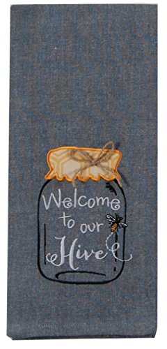 - Tea towel features uplifting embroidered saying in a mason jar with applique and twine bow accent
