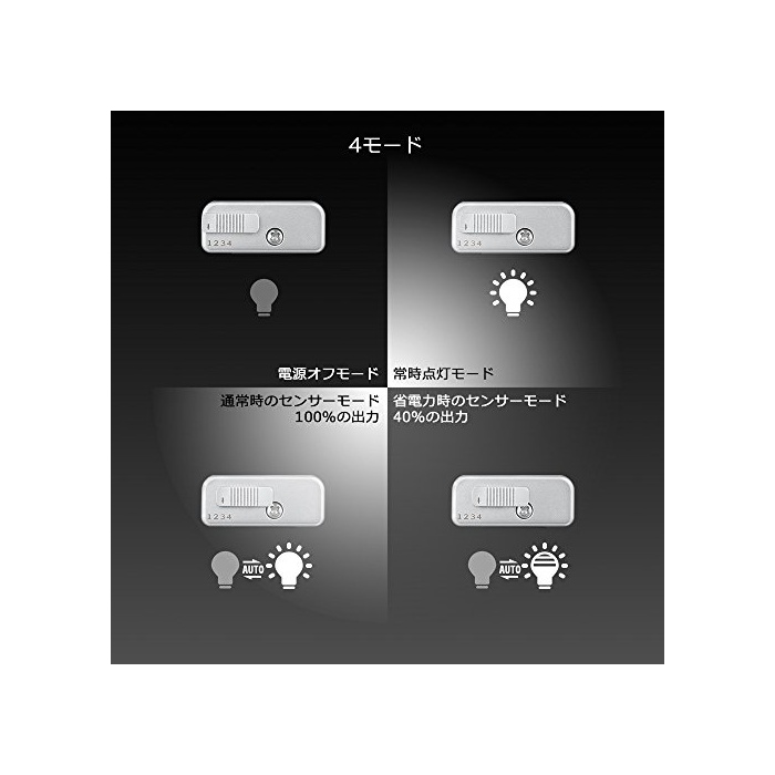4모드&에너지 절약전원 오프 모드,항시 점등 모드,100%광양센서 모드,40%광양센서 모드를 탑재.실내의 계단,아이와 노인의 방,지하실,closet,옷장,서가,방,텐트의 중,복도 등의 장소로 대활약입니다.2종류 출력에,저광량이 필요 시에 적용에 옵니다.