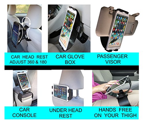 -. Feature : FROM CAR to COUCH to KITCHEN to SCHOOL -Its Strong Safe Grip rotates 360º with 160º swivel. Holds Big and Small Tablets & Smart Phones. Firmly Grips all size iPads, iPhone and all size Tablets and Smart Phones from 2 inches to 12 inches. Its Strong Grip keeps your Device Secure. It comes with a Life Time Manufacturer Replacement Guarantee. We want 100% Satisfied Customers / MOUNTS IN CAR Glove Box, Headrest, Visor & with Leg mount feature. It comes with a quick release so you can use the upper clamp separately in Stand Alone position or mount under headrest or on visor or hold it in your hand. / MOUNTS ON COUCH and recliner arm rest and back rest. Holds all Tablets and phones with cases. No need to take your case off. It also mounts on Airplane magazine rack, on the Train, Bus Seats. / MOUNTS IN KITCHEN on Cabinets, Drawers or in in Stand alone position. You can adjust the angle by sliding it up and down. Use in Bedroom by mounting it to a pillow. / IN SCHOOL AND OFFICE It holds hard back books. It can be used on a School Desk, in "Stand Alone" position. Why buy many holders when Clamp Champion works virtually every where. Thank you for your purchase. You can decorate and customize the Clamp surface with stickers. Plus % of your purchase helps charity.Designed & PATENTED in USA. Sold by USA Manufacturer helping produce jobs.