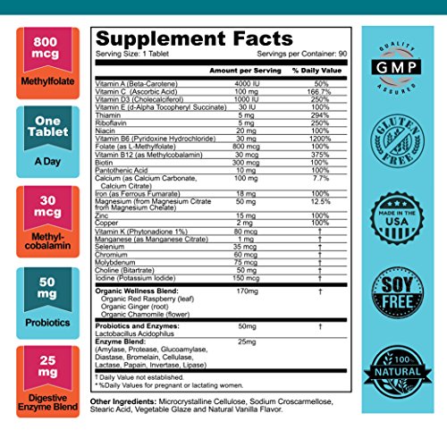 ♥ 800 mcg of METHYLFOLATE TO SUPPORT VITAL DEVELOPMENT: Our formula contains Methylfolate (a natural form of folic acid) and Methylcobalamin. Over 50% of people cannot absorb folic acid which most prenatal vitamins contain.