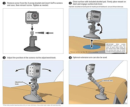 -. Binding : Electronics -. Brand : Arkon -. Color : Black -. EAN : 0808113975662 -. Feature : Fits all models of GoPro HERO camera / Sticky suction mount base bonds to flat or slightly textured surfaces / Modular arm extends height from 3.5 inches to 7 inches / Use mount to live stream with GoPro on Periscope or Meerkat / 2 year limited warranty -. Label : Arkon Resources Inc. -. Manufacturer : Arkon Resources Inc. -. Model : GP198 -. MPN : GP198 -. PackageQuantity : 1 -. PartNumber : GP198 -. ProductGroup : Photography -. ProductTypeName : CAMERA_OTHER_ACCESSORIES -. Publisher : Arkon Resources Inc. -. Studio : Arkon Resources Inc. -. Title : Arkon Sticky Suction Windshield Dash Mount Holder for GoPro HERO4 Session HERO4 HERO3+ HERO3 HERO2 and HERO Action Cameras -. UPC : 852839380385