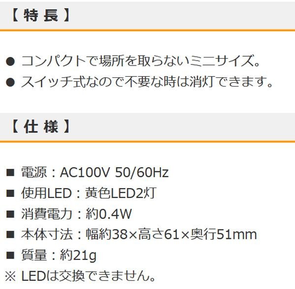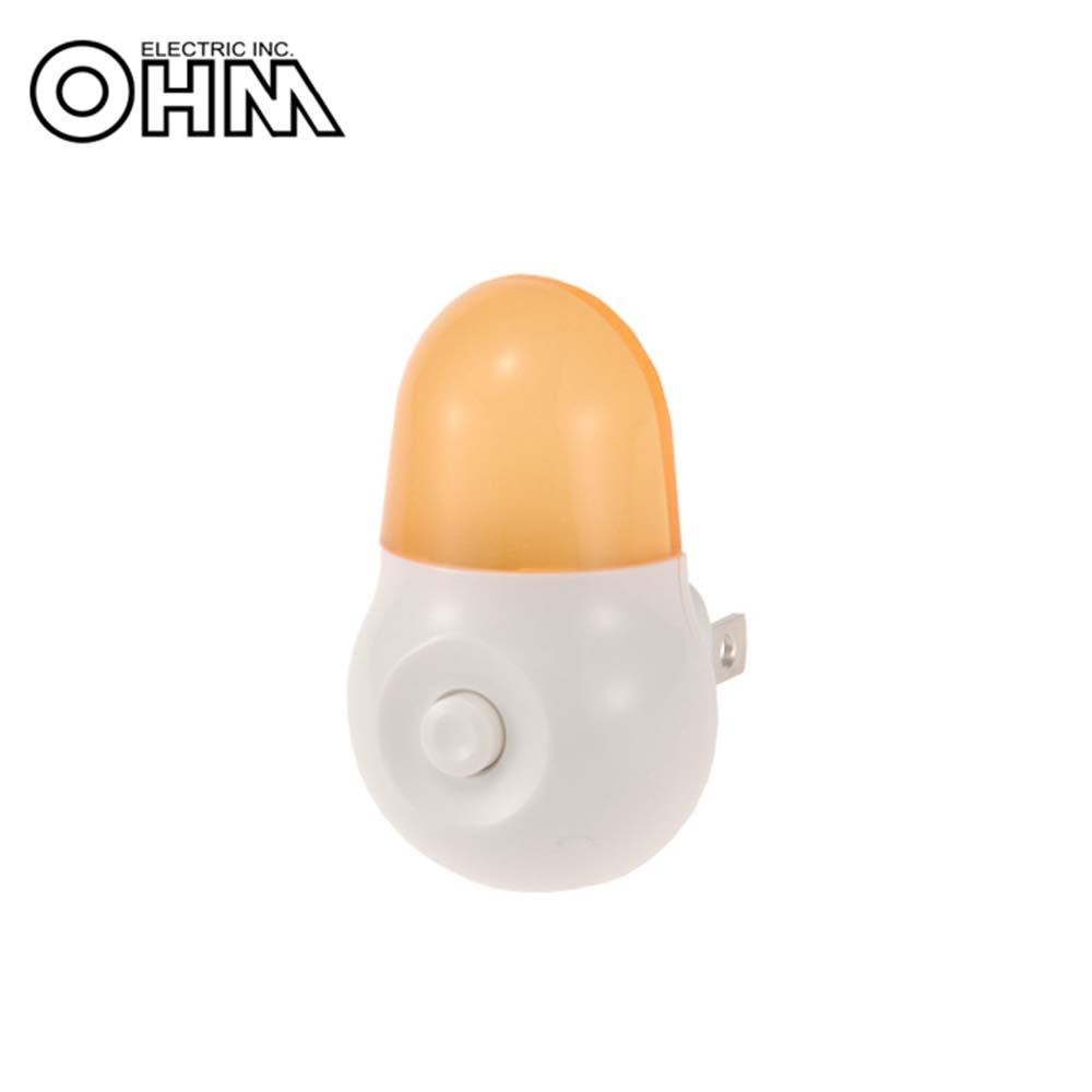 スイッチ式なので不要な時は消灯できます。 生産国:中国 ※サプライヤー直送品 ご注文後2~3営業日後の出荷となります【商品名】OHM LEDナイトライトミニ オレンジ 黄色LED AN1-PY