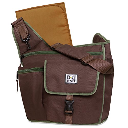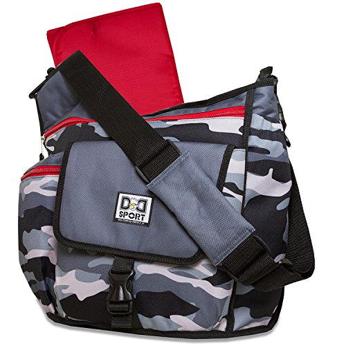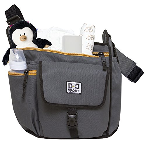 Diaper Dude Sport Bag by Chris Pegula - Grey Sling MessengerLeave it to designer Chris Pegula to create the complete diaper bag for the cool Dad. The easy masculine vibe of the grey print with gold trim and black web is just the beginning. A handy checklist printed inside ensures he's packed everything baby needs, and multiple inside and outside pockets keep it organized. A wipe clean changing pad is included. There's even a key hook and a padded tablet pocket that fits most sizes. And, since Dad needs hands free to handle every challenge, an adjustable, padded shoulder strap adds comfort and convenience.