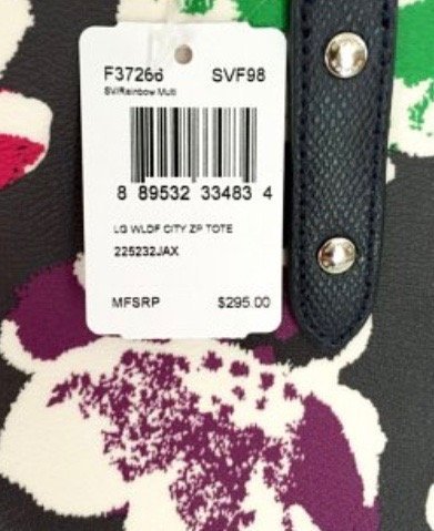 Details Printed coated canvas Inside zip, cell phone and multifunction pockets Zip-top closure, fabric lining Handles with 9 1/2" drop 11 3/4" (L) x 10 1/2" (H) x 5 1/2" (W)