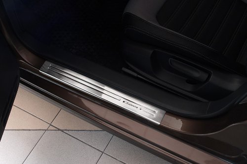 -. Feature : Passend für SKODA OCTAVIA II Baujahr 2003 - 2012 / Komplett aus V2A Edelstahl mit in die Längsrichtung fein gebürsteter Oberfläche / Abkantung und Hochglanzprägung (Rillen) nach Innen. / 4-teiliges Edelstahl Einstiegsleisten Set für alle Türen / Exclusive Schriftzüge auf beiden vorderen Einstiegsleisten