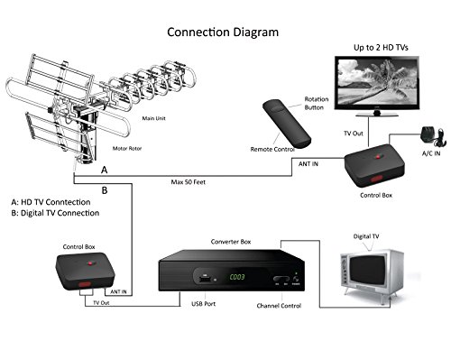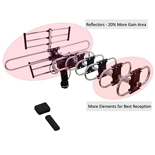 Supports HDTV 1080p,1080l,720p Broadcast Digital TV and HDTV Ready Antenna Full band DTV/VHF/UHF Receiver 360 Degree Rotation Wireless Remote Easy Bracket Installation. - Gain 15-35db - Auto Gain Control which is designed to receive signal between more wider range