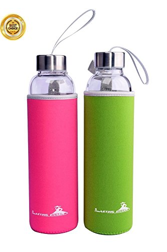 Lasting Charm Reusable Glass Water Bottle with Nylon Protective Case and Carrying Loop,Stainless Steel Cap 18 oz(Pink/Green,Pack of 2)