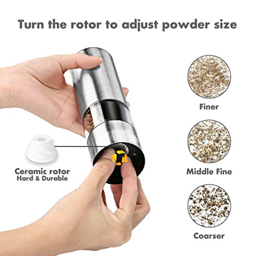 ✔ Durable: The core component "rotor" is made of ceramic which offers high durability &hardness, will easily grind the toughest peppercorns,Himalayan salts or other spices. The body is made of stainless steel.