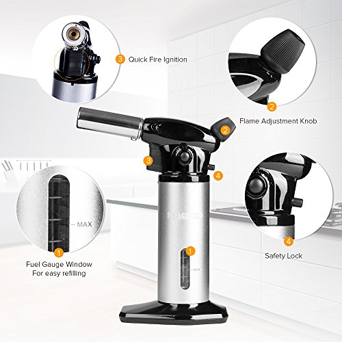 EASY: Our refillable butane torch has a flame adjusting regulator that will allow you to choose the intensity of the flame, depending on what you are cooking every time.