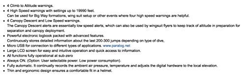 Studio : LB Publisher : LB Binding : Misc. Product Description 4 Climb to Altitude warnings. 4 High Speed warnings with settings up to 19990 feet. Can be used for Big Way formations, wing suit setup or other events where four high speed warnings are helpful. 4 Canopy Descent and Low Speed warnings. The Canopy Descent alerts are essentially low speed alerts, which can also be used by wingsuit flyers to keep track of altitude in preparation for separation and canopy deployment. Powerful electronic logbook packed with anvanced features. Continuously stores detailed information about the last 200-300 jumps depending on type of dive, Micro USB for connection to different types of applications. Large LCD screen for easy and intuitive operation and quick access to information. All functions fully operational at sub-zero Always ON. (Option: User selectable power. Low power consumption). Fully automatic. It continually records the ambient air pressure, temperature and adjusts the digital hardware to the local elevation. Thin and ergonomic design ensures a comfortable fit in a helmet. 0