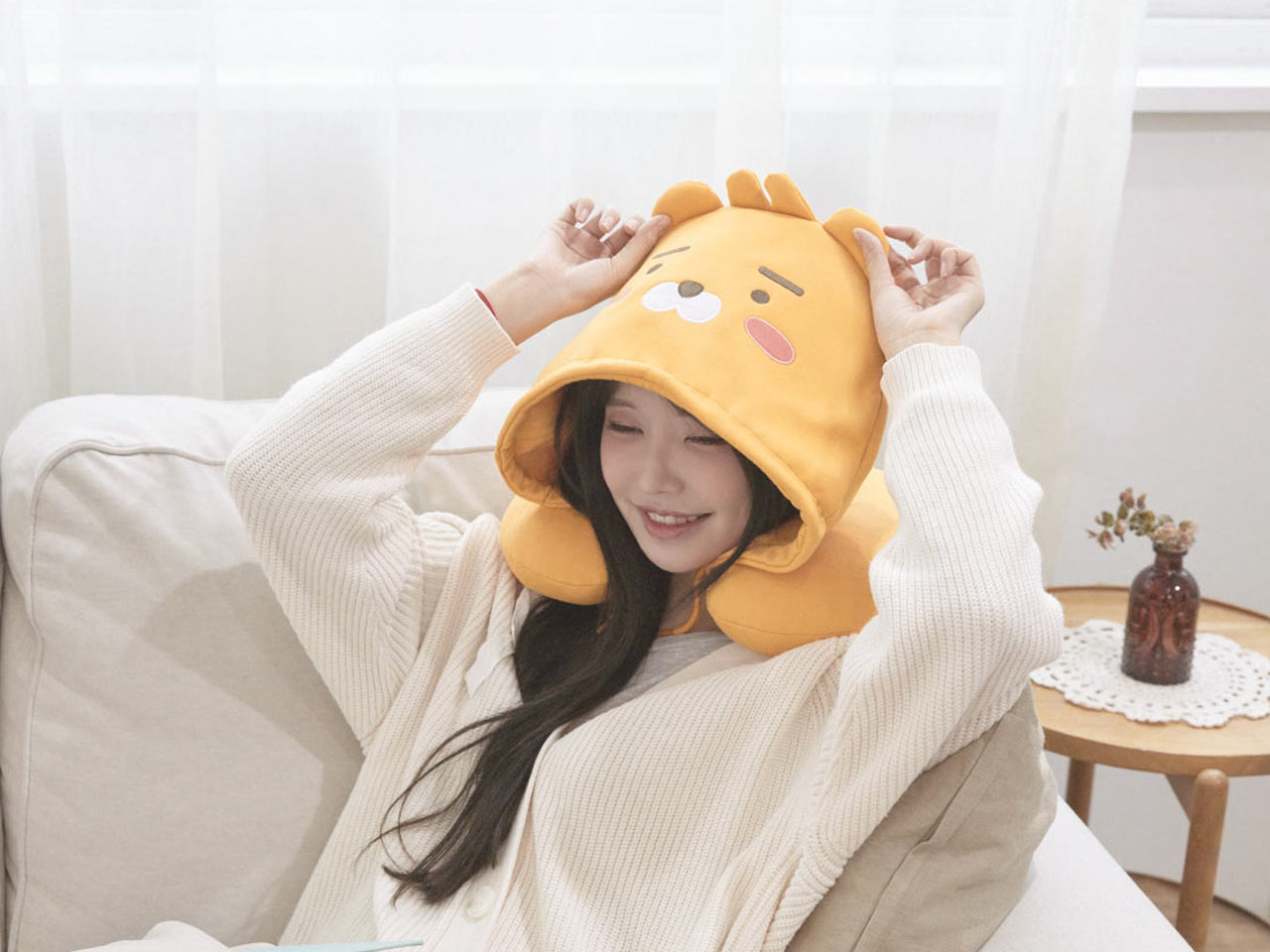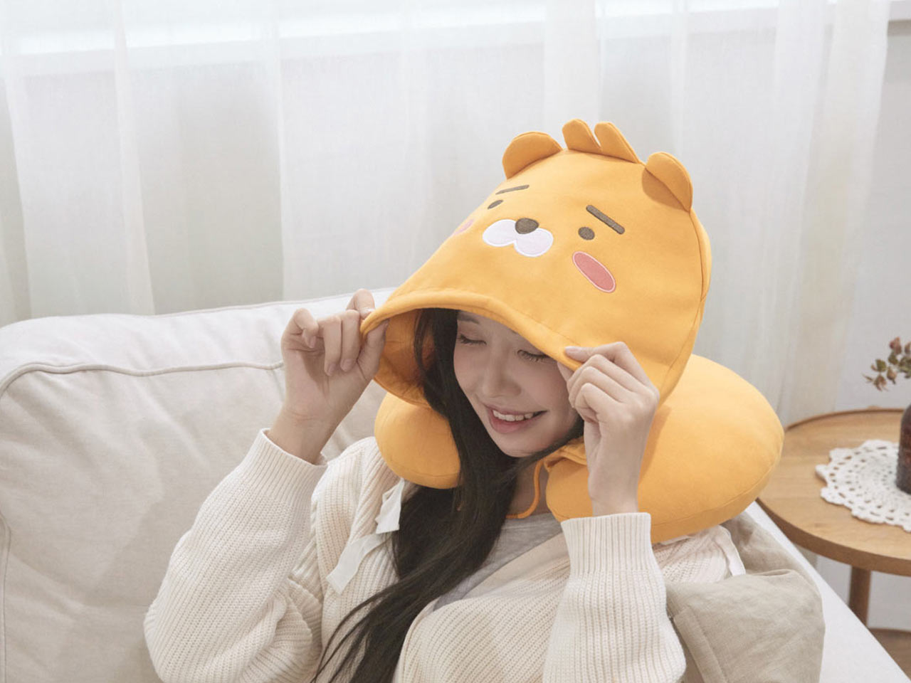 목베개와 수면 안대를 따로 챙길 필요 없는 라이언 후드목베게를 챙겨보세요!