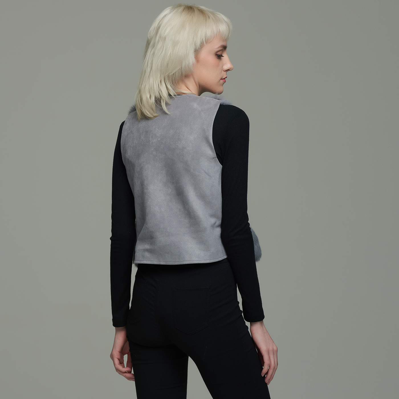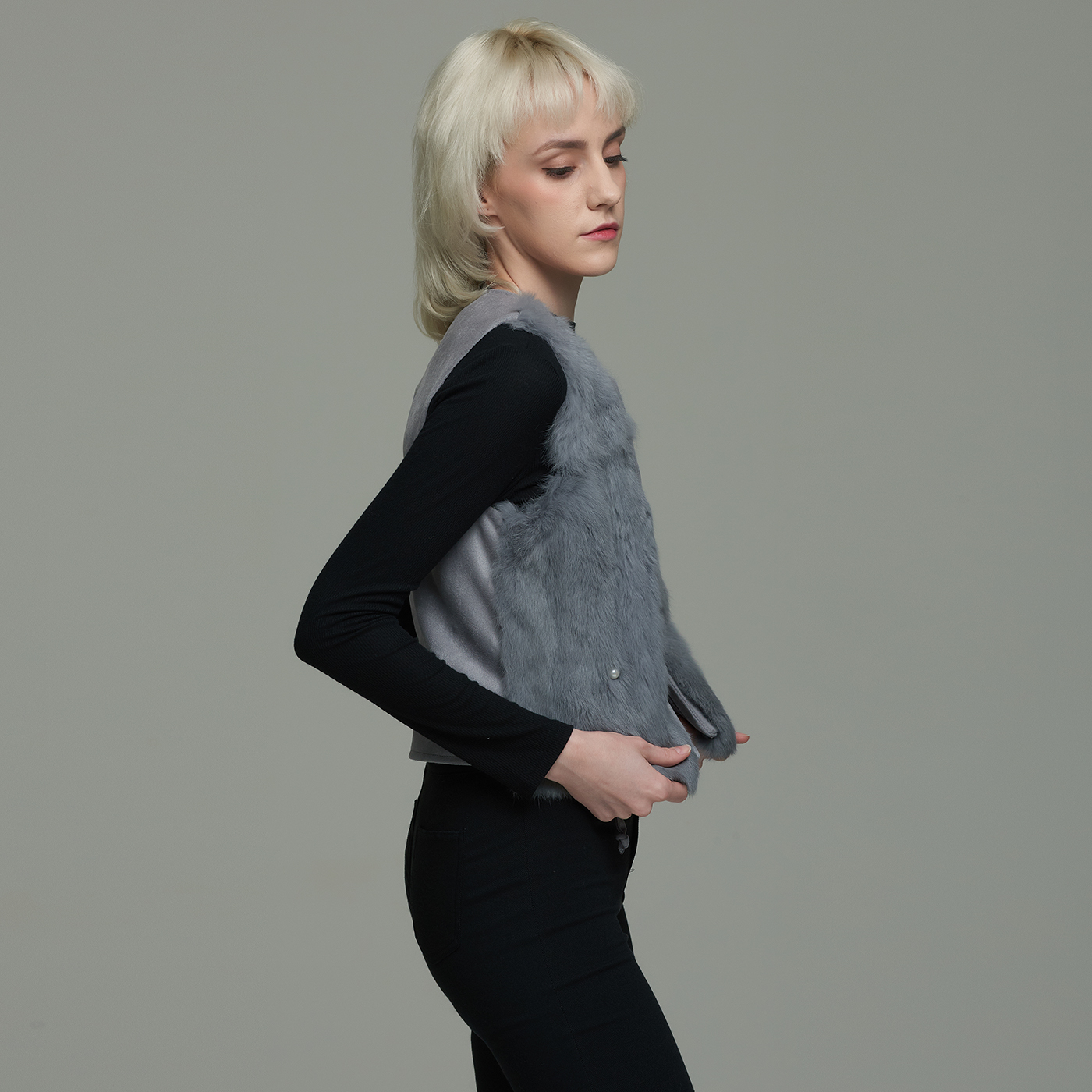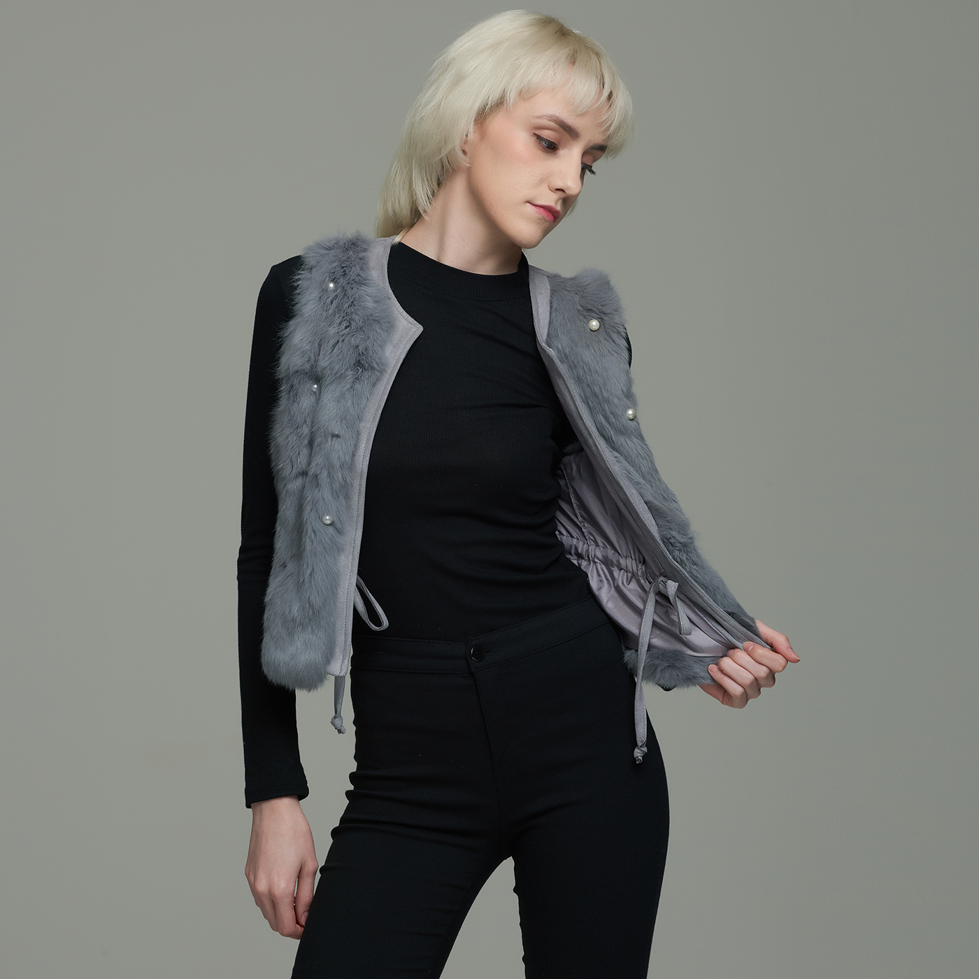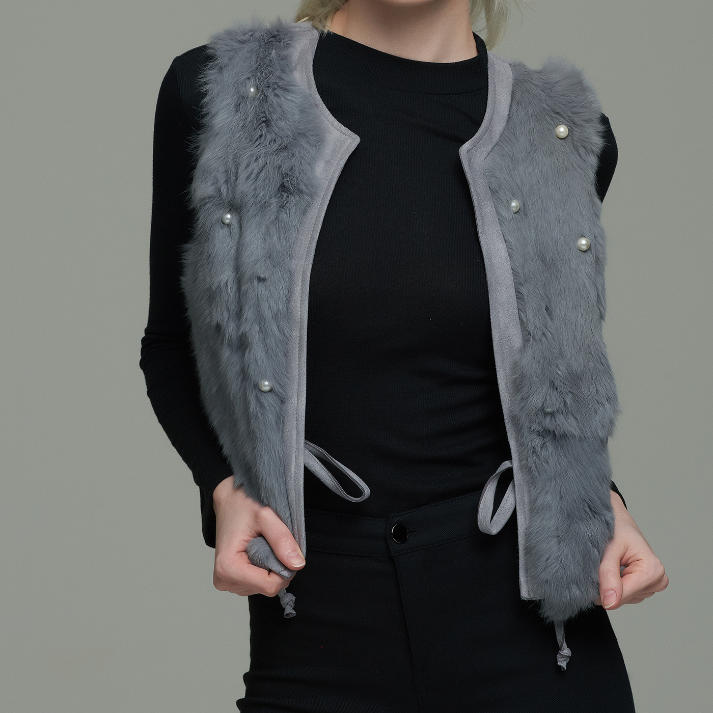 허리 벨트가 있는 진주장식의 퍼 베스트로 큐티하고 포근한 스타일입니다.