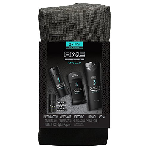 Includes one 4 oz AXE Apollo Body Spray, one 16 oz AXE Apollo Body Wash, one 2.7 oz AXE Apollo Antiperspirant, and a bonus 1 oz AXE You travel size body spray all in a reusable washbag