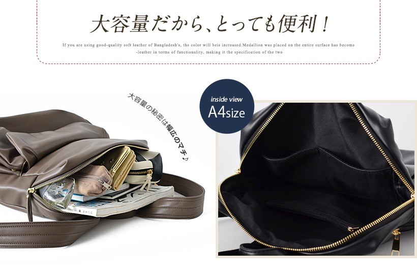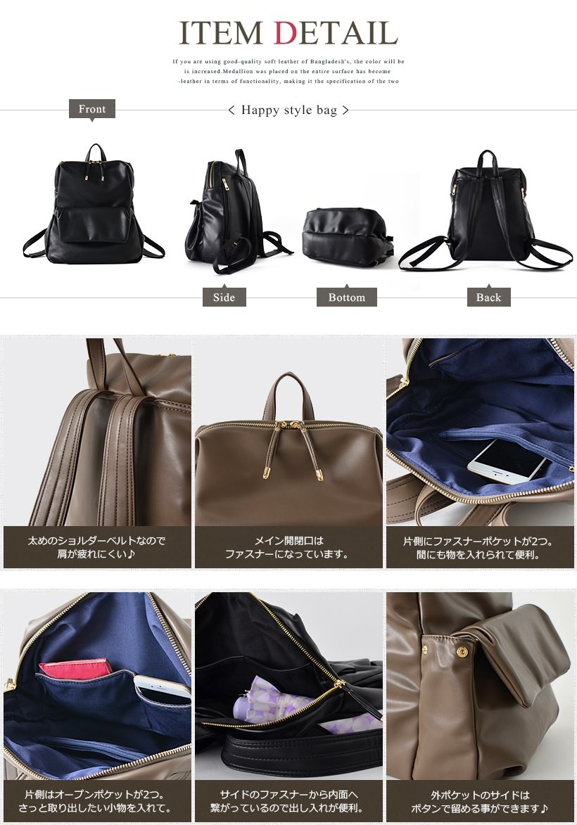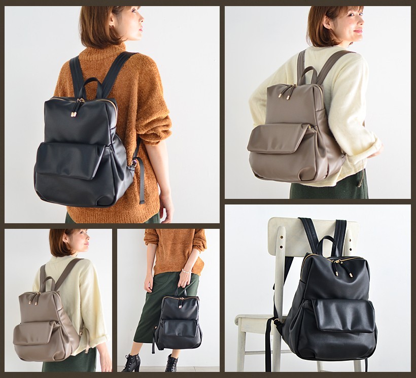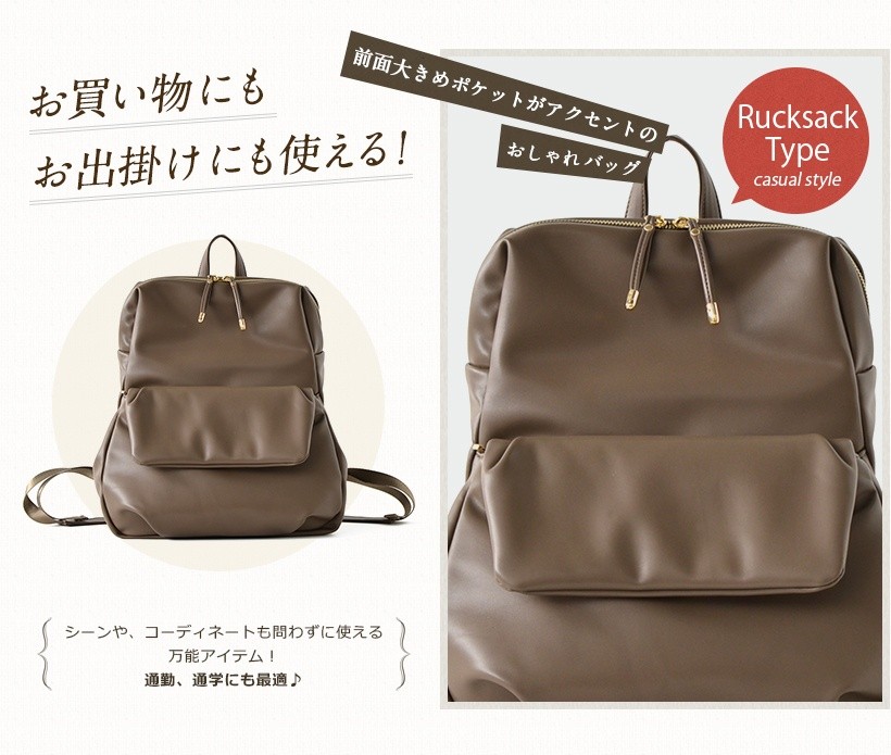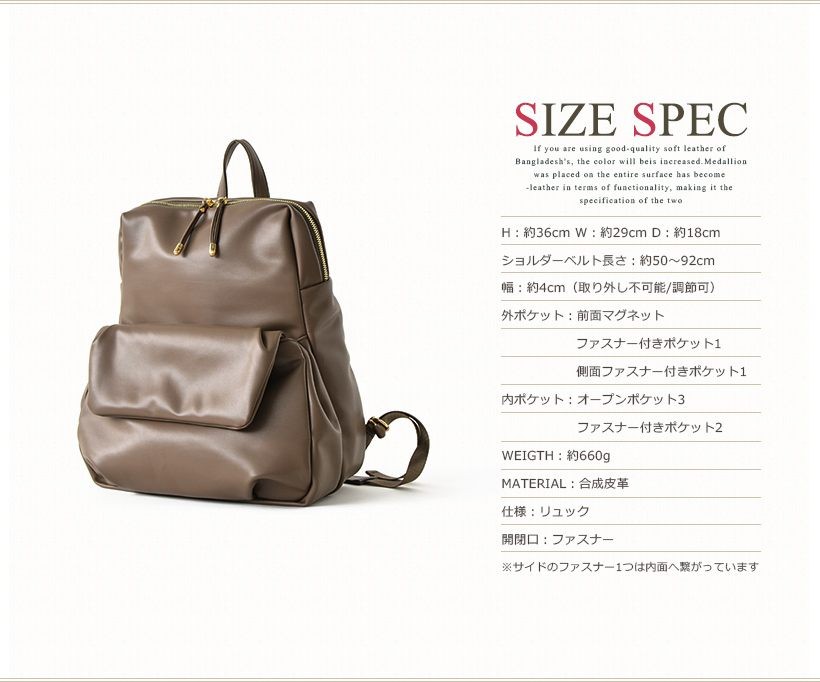 飾り気のないシンプルなデザインのリュックサック。とっても肌触りがいい柔らかいフェイクレザーを使用しているので、クタッとした自然なフォルムが魅力。●SIZE:高さ:約36cm / 幅:約29cm / マチ:約18cm●ショルダーベルト長さ:約50~92cm×幅:約4cm(取り外し可能/調節可)●外ポケット:前面マグネット&ファスナー付きポケット1、側面ファスナー付きポケット1●内ポケット:オープンポケット3、ファスナー付きポケット2●重さ:約660g●素材:合成皮革●仕様:リュック●バッグのメイン開閉口はファスナーになっております。●※サイドのファスナー1つは内面へ繋がっています。