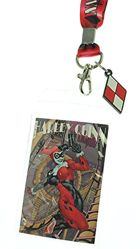 Product Description DC Comics lanyard with Harley Quinn comic logo design. Includes a clear id sleeve, deadpool plastic charm, and quick release clip. 0