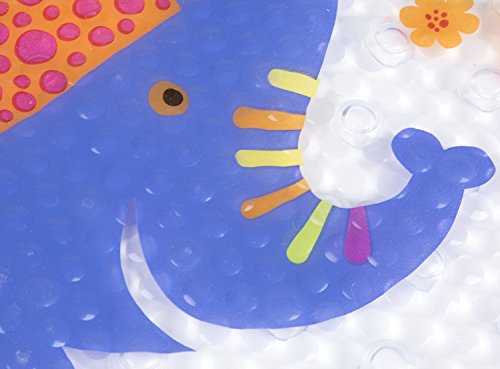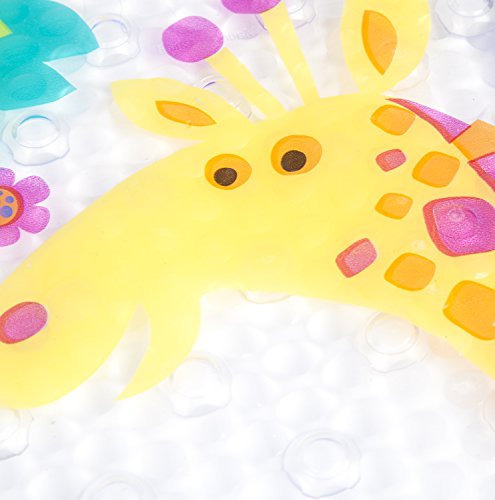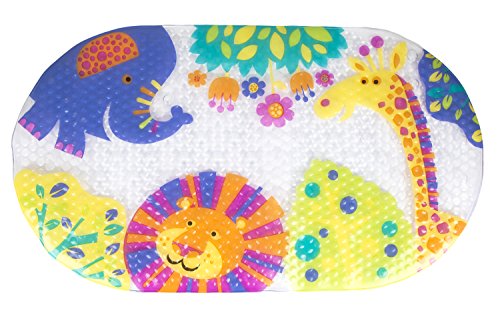 - FUN SAFARI FRIENDS: It’s time for your child to look forward to bathing! Featuring an adorable arrangement of safari animals like a giraffe, lion, and elephant, this bath mat is sure to put a smile on your little one’s face.